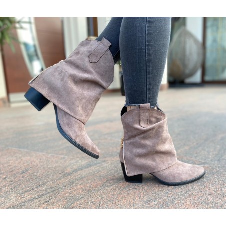 Zamszowe kowbojki z wywijaną cholewą łączą w sobie elegancje z odrobiną nowoczesności .